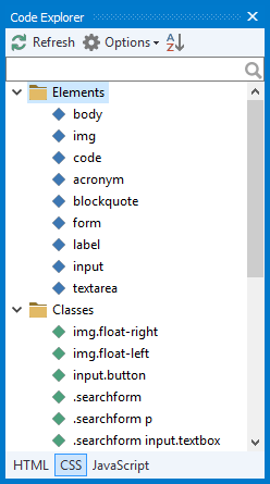 Code Explorer lists CSS selectors in the CSS file and allows you to quickly move to any of them.