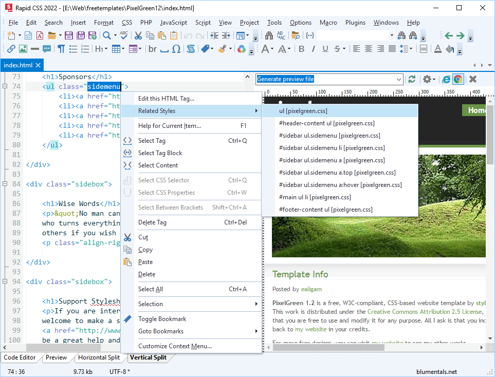 CSS formatting features help you modify style sheets or HTML inline style code very quickly with a single click or shortcut-key press.